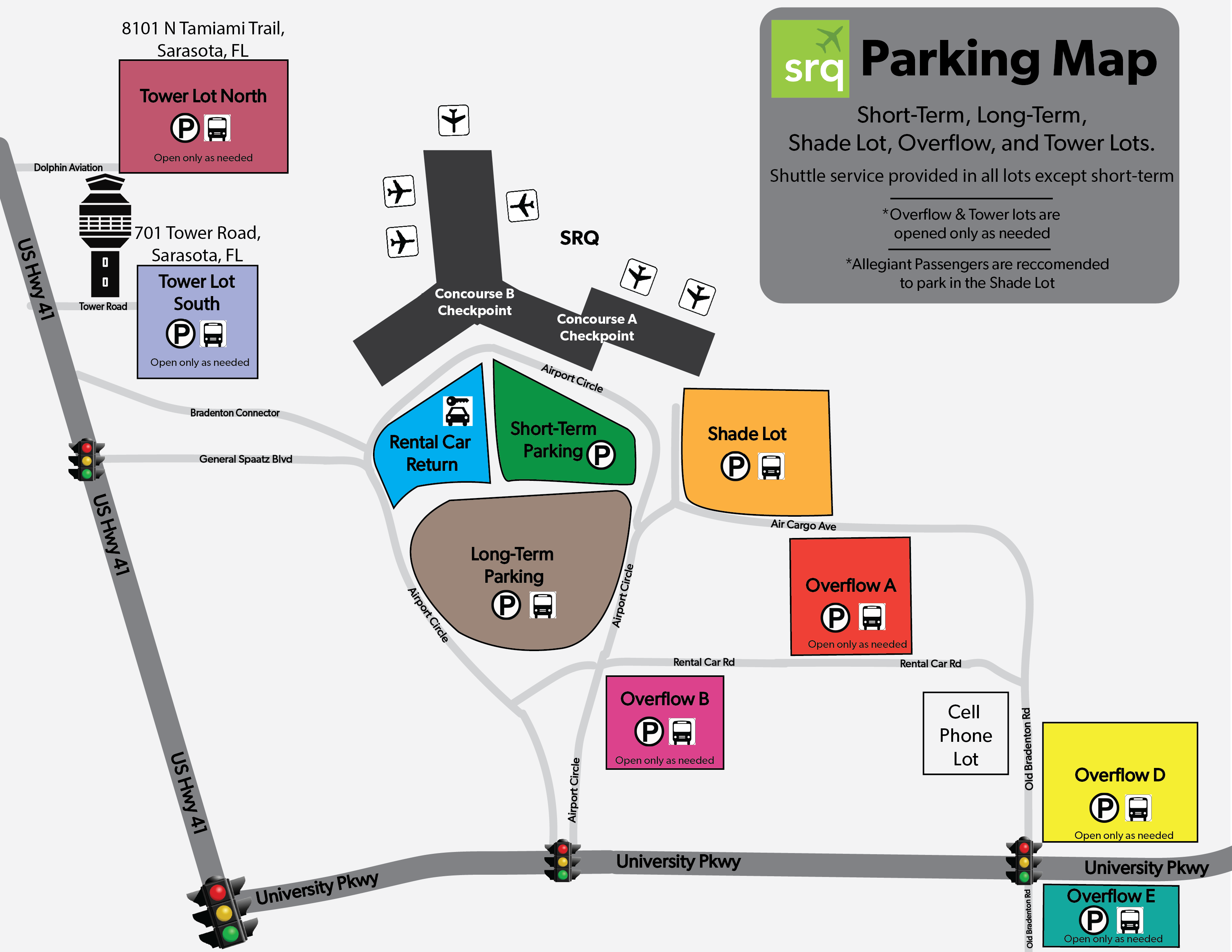 Short-term parking is available directly across the terminal building. There is a free parking shuttle operating between the Long-term lot, and all overflow parking lots once Long-term is full. While we do not run out of spaces, parking lots do fill up and overflow parking opens when needed with shuttle service to the terminal. Please plan your trip to SRQ accordingly. The shuttle service to the front of the terminal is available from two hours prior to the first morning departure until after the last scheduled arriving flight, even if delayed. American Express, VISA, MasterCard, and Discover credit cards are accepted.